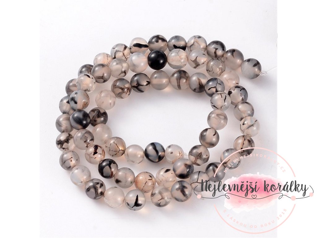 Přírodní korálky z minerálu achát, částečně průhledné s černým žíháním, po kterém dostal své jméno.