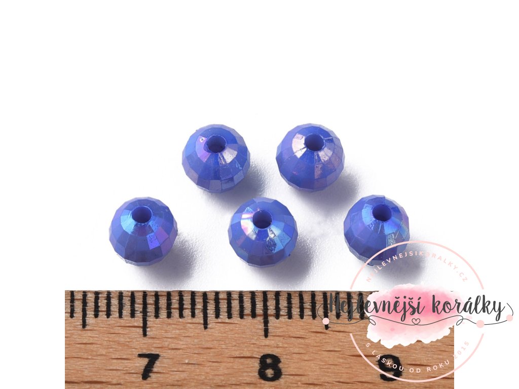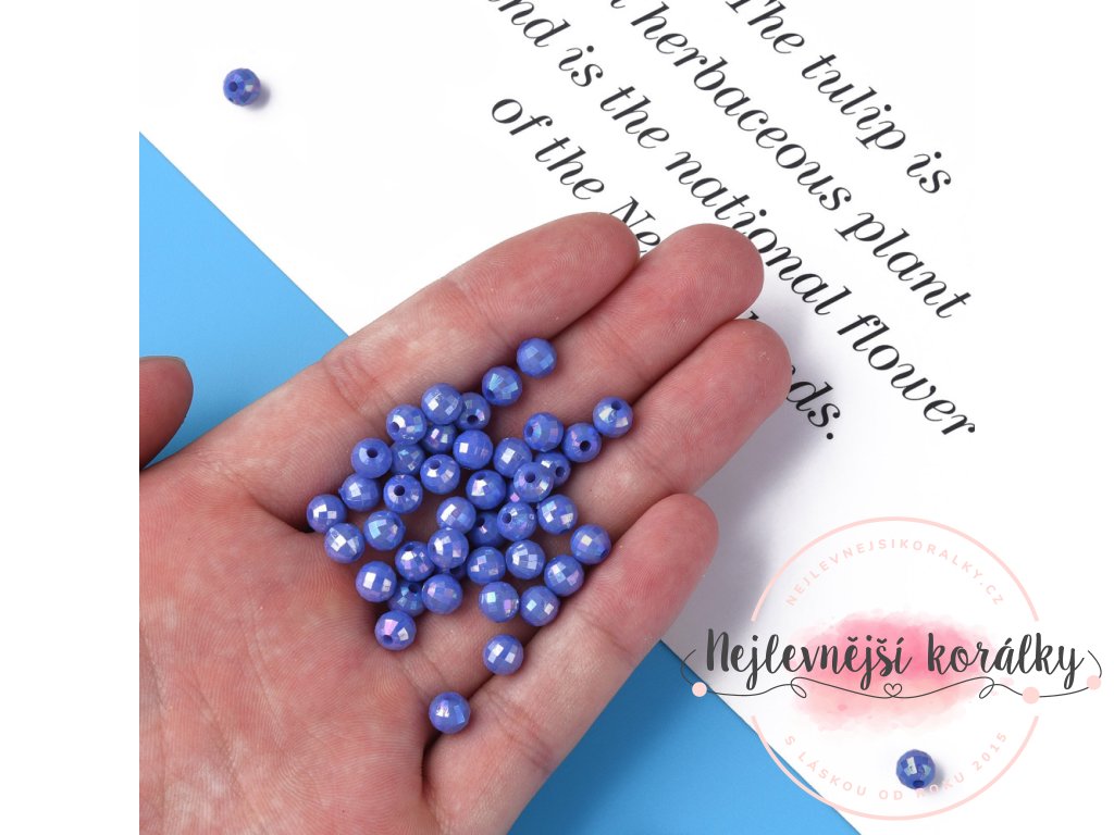 Akrylové broušené korálky s AB efektem ve světe modrém provedení o velikosti 6 mm s velikostí průvleku 1,5 mm.