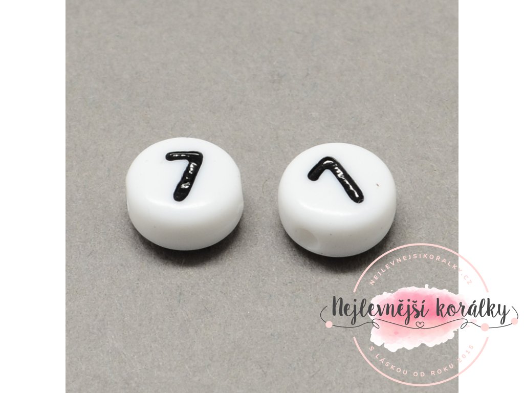 Akrylové korálky s čísly o délce 7 mm, šířce 7 mm, hloubce 4 mm a velikosti průvleku 1 mm.
