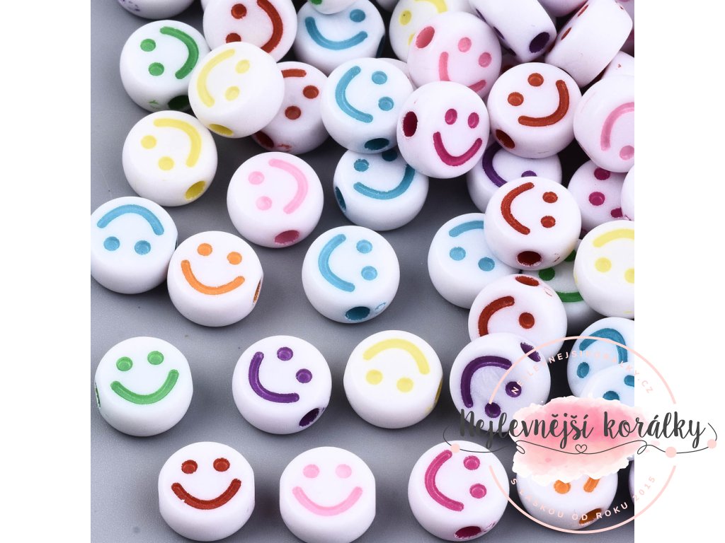 Akrylové korálky v bílém provedení s barevnými smajlíky o délce 10 mm, šířce 10 mm, hloubce 5 mm s velikostí průvleku cca 2 mm.