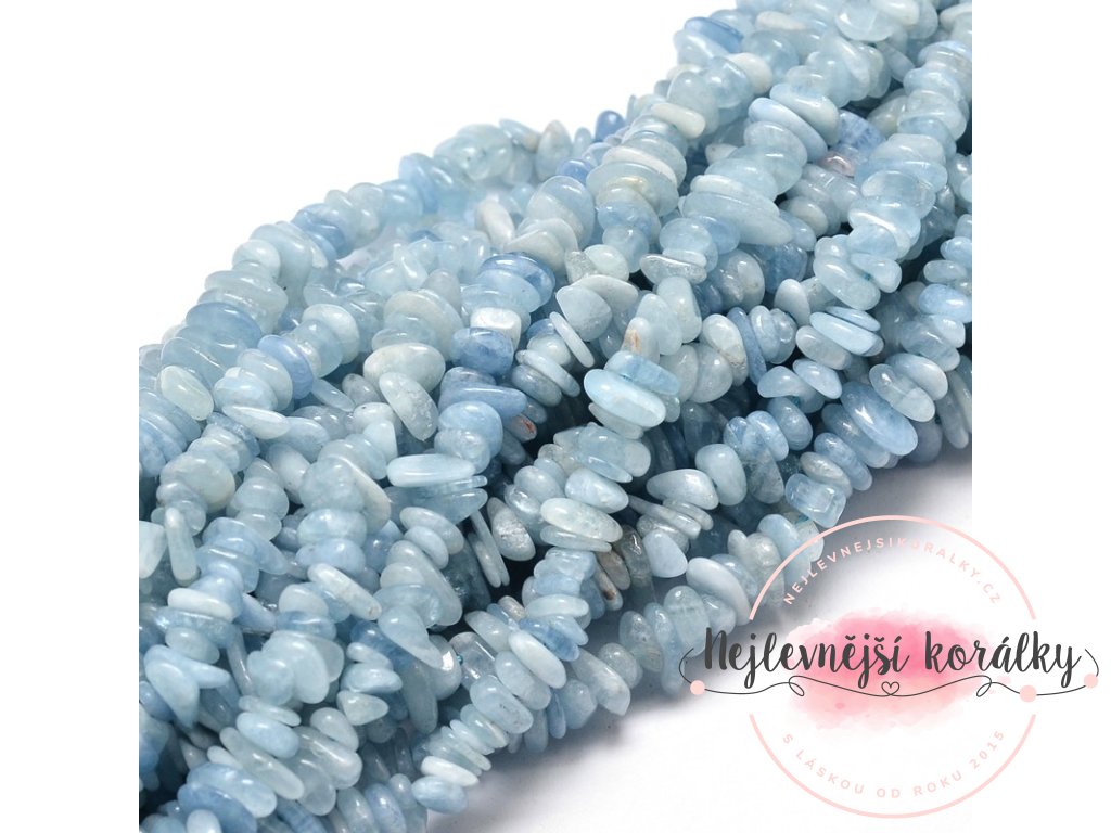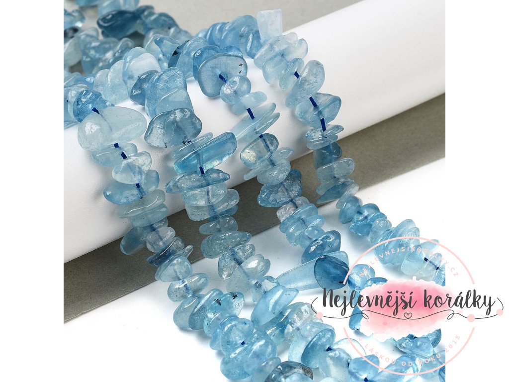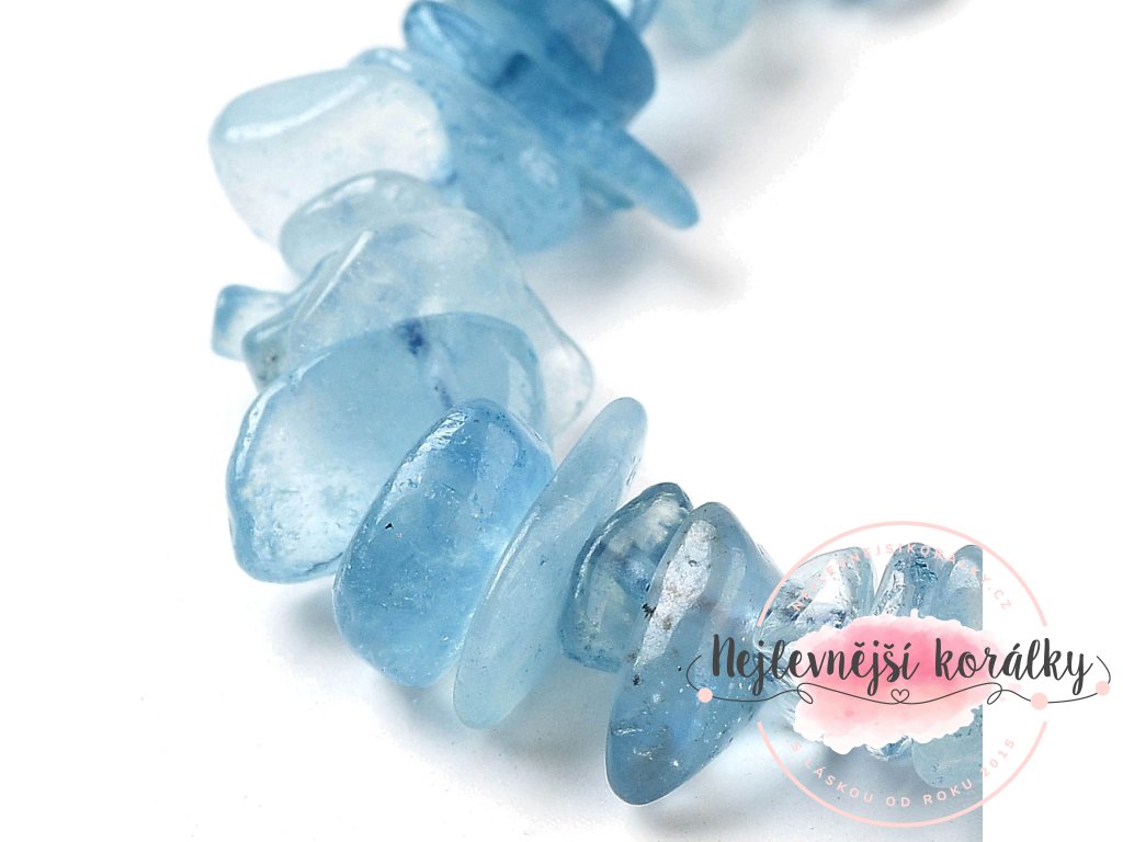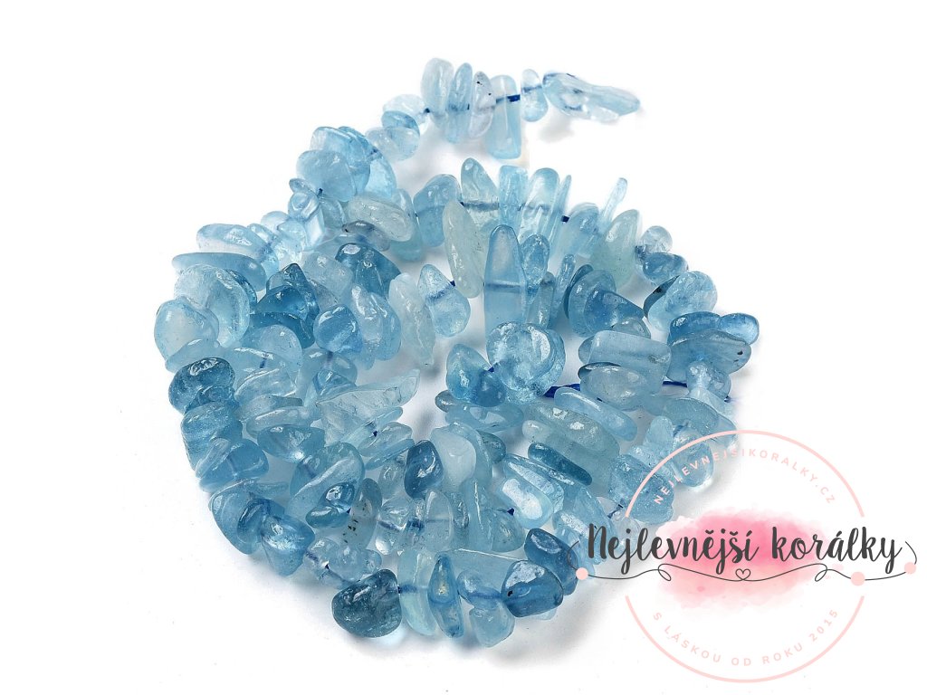 Přírodní korálky z minerálu akvamarín ve tvaru zlomků o délce cca 5 ~ 14 mm, šířce cca 4 ~ 10 mm.