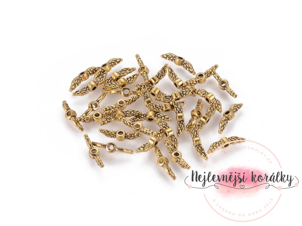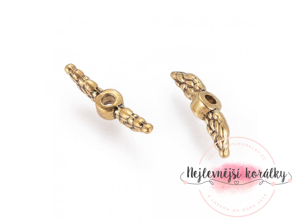 Andělská křídla ve starozlatém provedení o šířce 12 mm, výšce 3 mm, hloubce 3 mm s velikostí průvleku 1,5 mm.