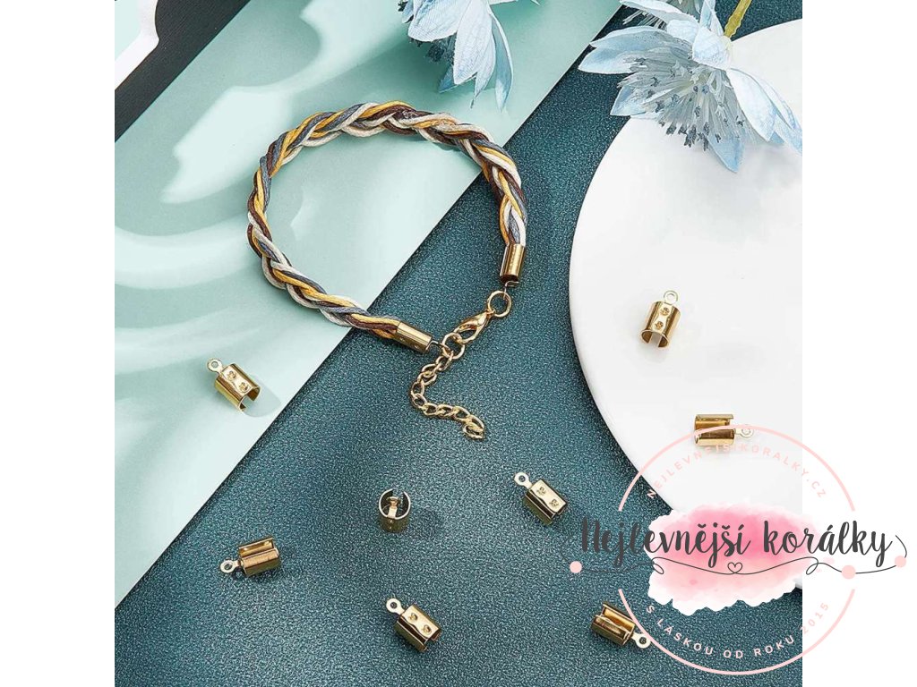 Tyto koncovky z nerezové oceli 304 s pravým 18K zlatem jsou elegantním a odolným řešením pro zakončení šňůrek, stuh nebo vícepramenných návleků. Zahýbací klapky zajišťují pevné uchycení, které lze pro větší bezpečnost zakápnout lepidlem.