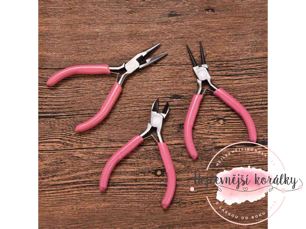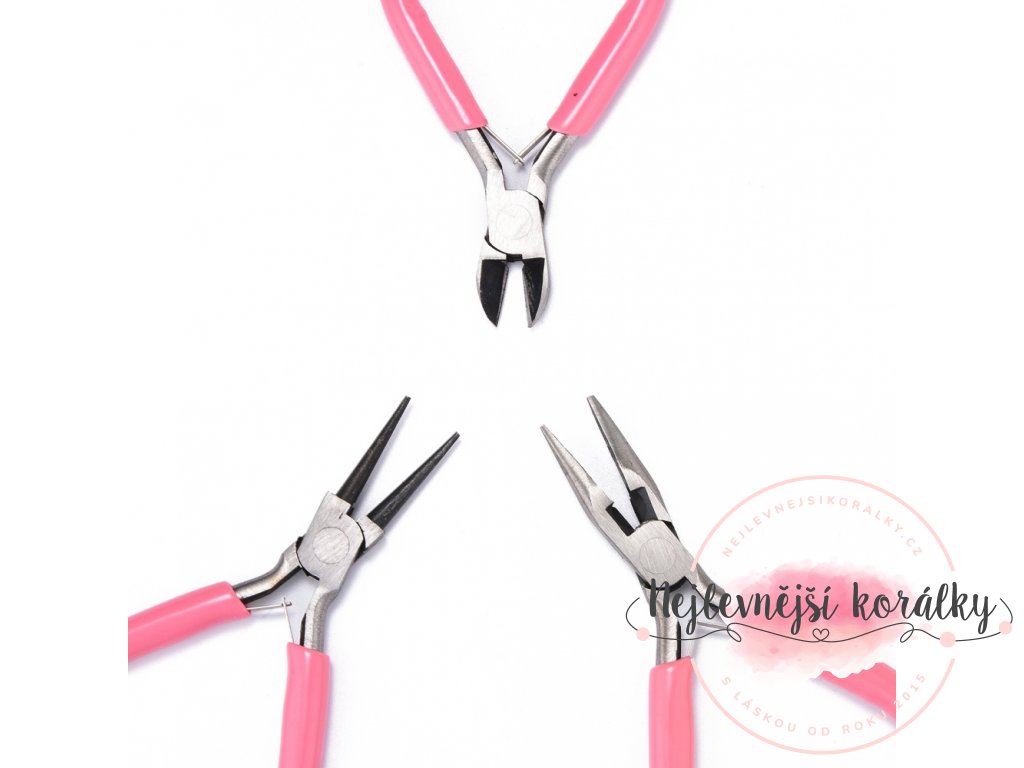 Sada 3 druhů kleští z oceli s růžovými ručkami.