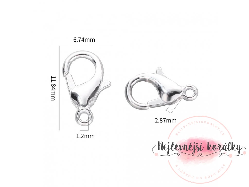 Karabinka v různých barevných provedeních o výšce 12 mm, šířce 6 mm a s očkem pro průvlek o průměru 1,2 mm.