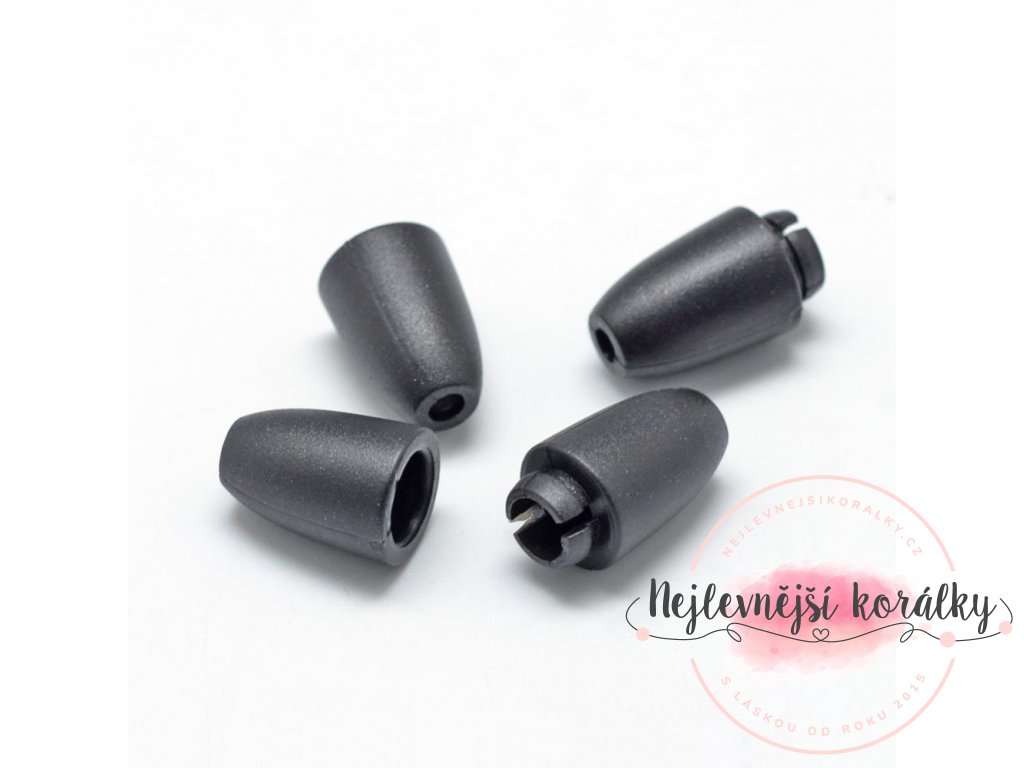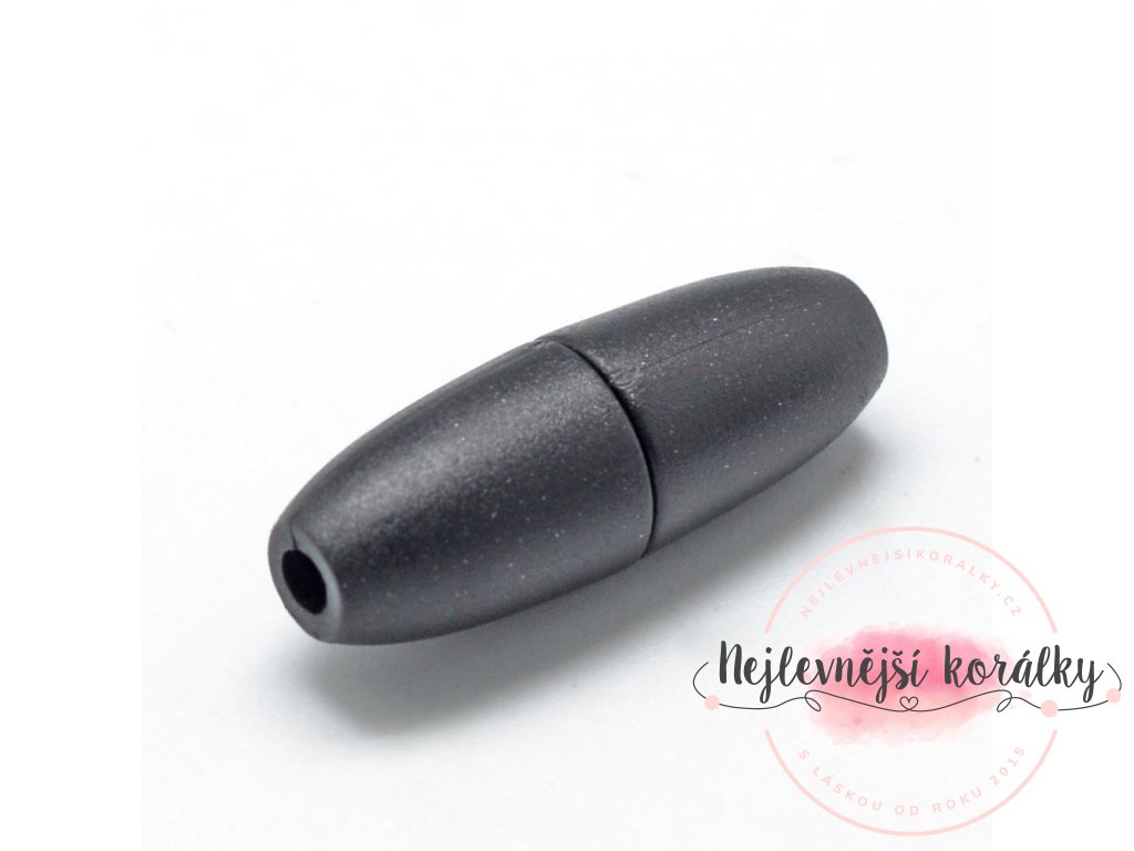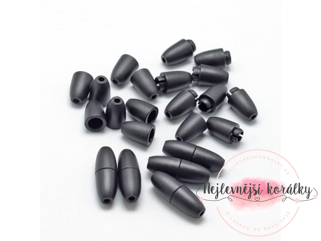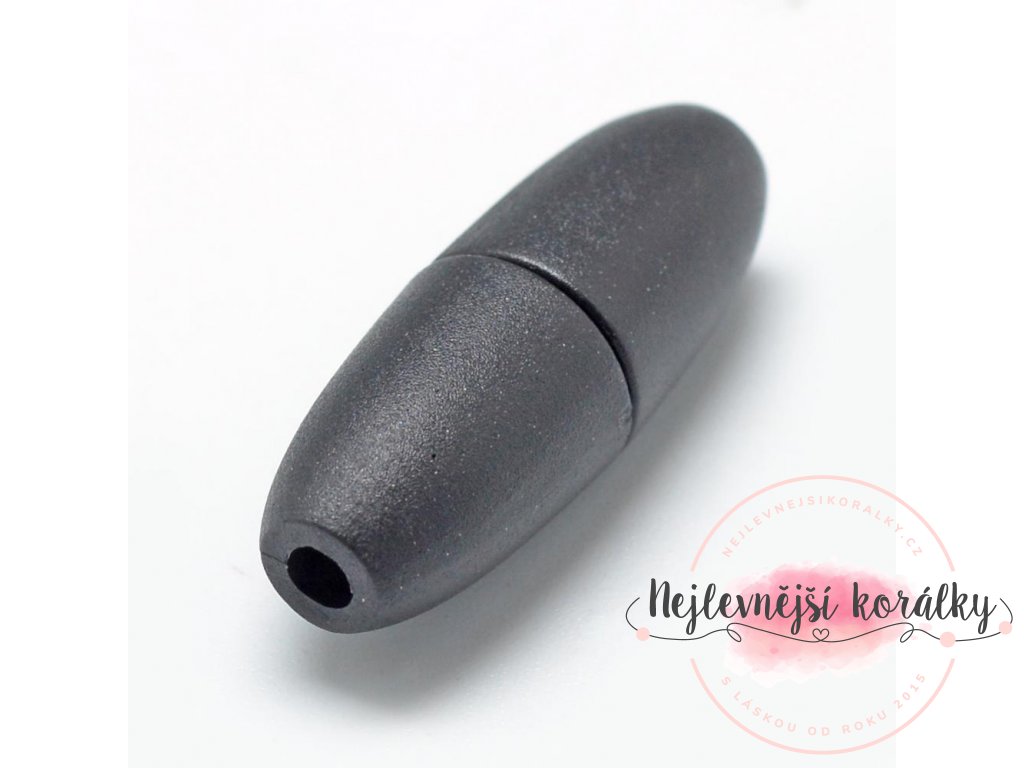 Plastové bezpečnostní zapínání v černém provedení o délce 24 mm a průměru 9 mm s velikostí průvleku cca 2,5 mm.