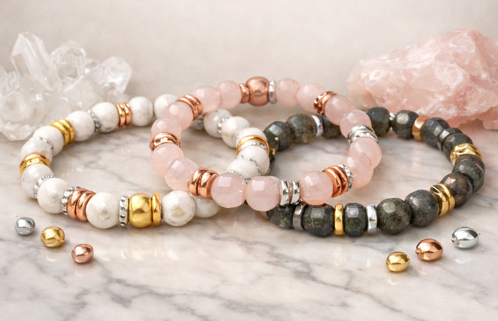 Hra s barvami kovů umožňuje jemně navázat na tón minerálu nebo vytvořit záměrný kontrast. Zlaté, stříbrné i růžově zlaté rondelky lze mezi sebou bez obav kombinovat.