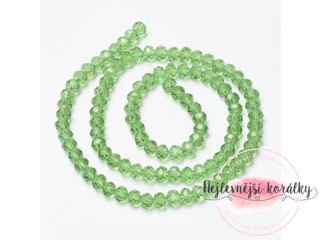 Broušené korálky v zeleném průsvitném provedení o délce 8 mm, šířce 8 mm, hloubce 6 mm s průvlekem o velikost 1 mm.