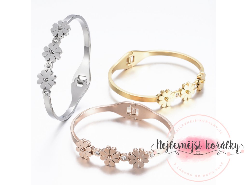 Luxusní náramek je zdoben třemi květinami střídající se s kamínky, má oválný tvar a doporučujeme jej na obvod zápěstí od 15,5 do 17 cm.