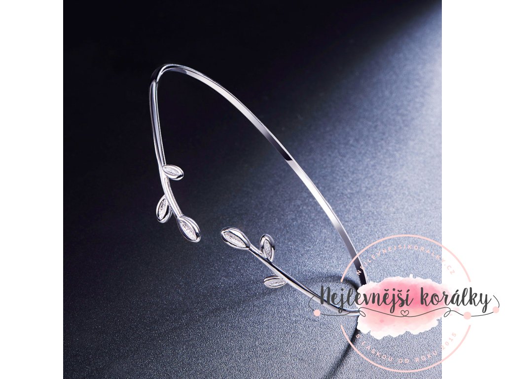 Náramek má otevřený design, který je zdoben jemným motivem větviček