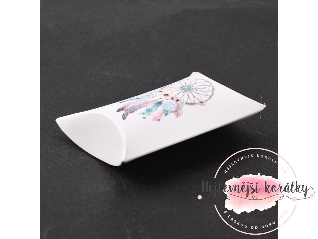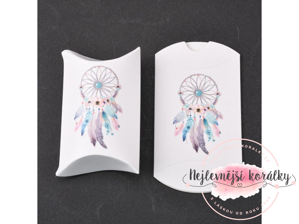 Dárková krabička v bílém provedení s obrázkem lapače snů je vyrobena z tvrdého papíru.