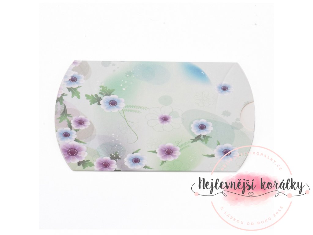 Skládací papírová dárková krabička květinami o délce hotové krabičky 8 cm, šířce 5,5 cm a hloubce 2 cm.