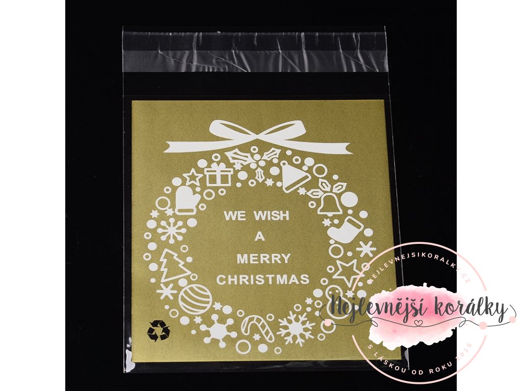Celofánový sáček s lepící klopou - "we wish a merry christmas" - zlatý - 14 x 10 cm - 1 ks