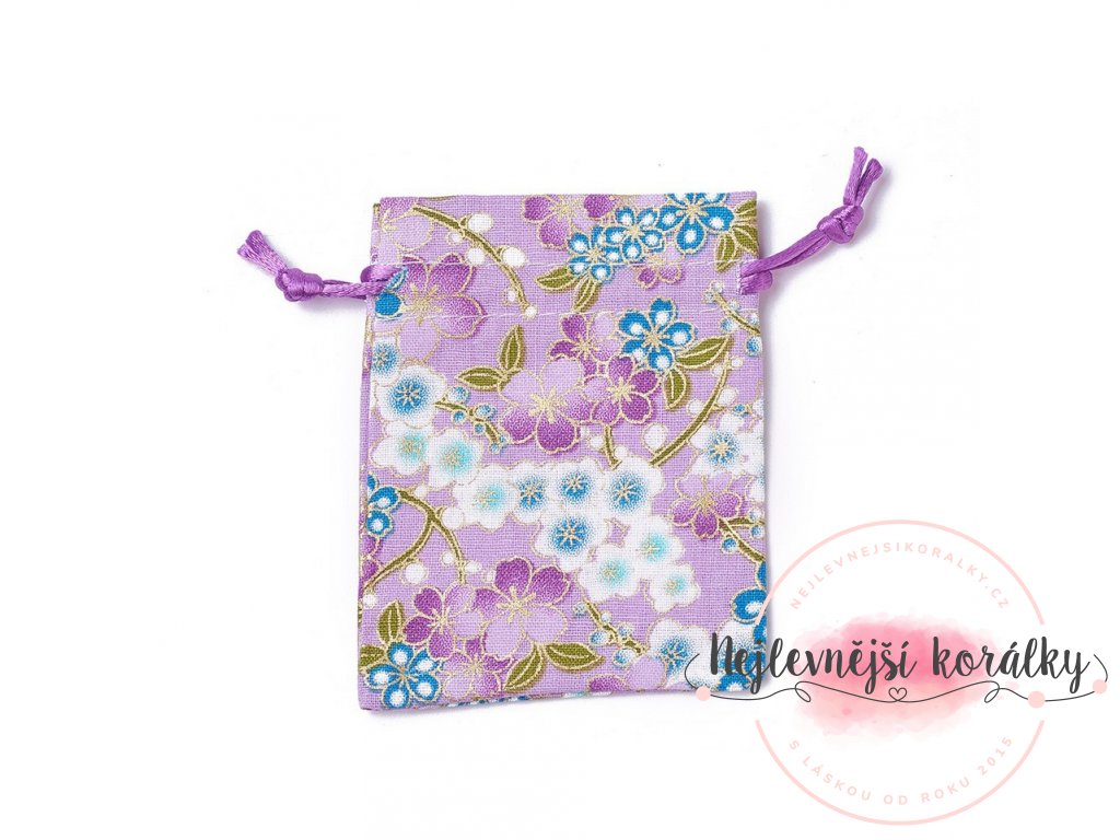Dárkový pytlíček z pytloviny ve fialovém provedení s motivem květin o délce 10 ~ 10,5 cm a šířce 8 ~ 8,3 cm.