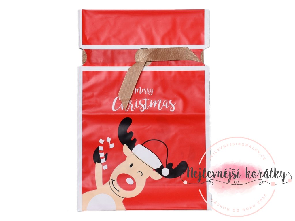 Sáček v červeném provedení je potištěn z obou stran a na sáčku je vánoční motiv soba Rudolfa s anglickým nápisem "Merry Christmas"" – Veselé Vánoce.