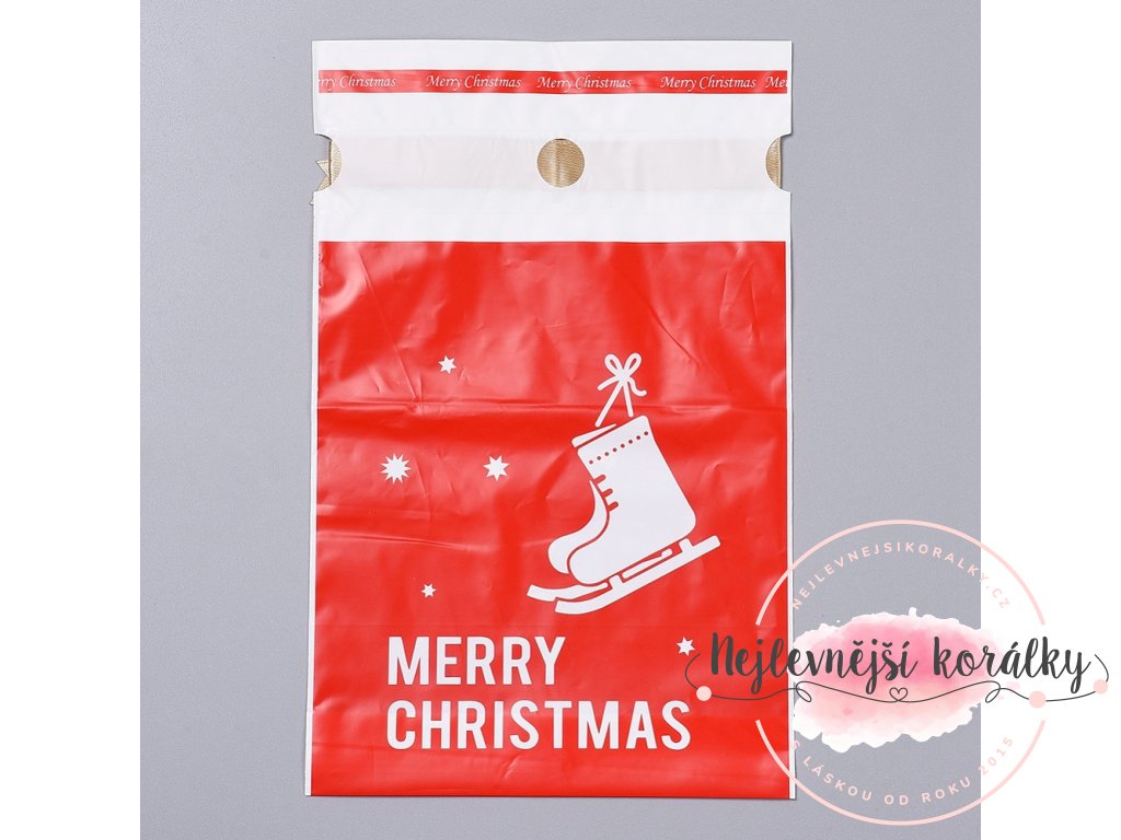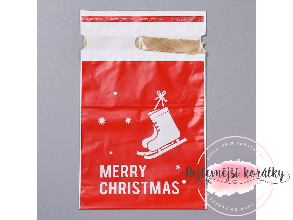 Sáček v červeném provedení je potištěn z obou stran a na sáčku je vánoční motiv bruslí s anglickým nápisem "MERRY CHRISTMAS"" – Veselé Vánoce.