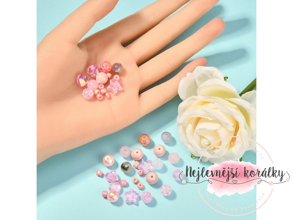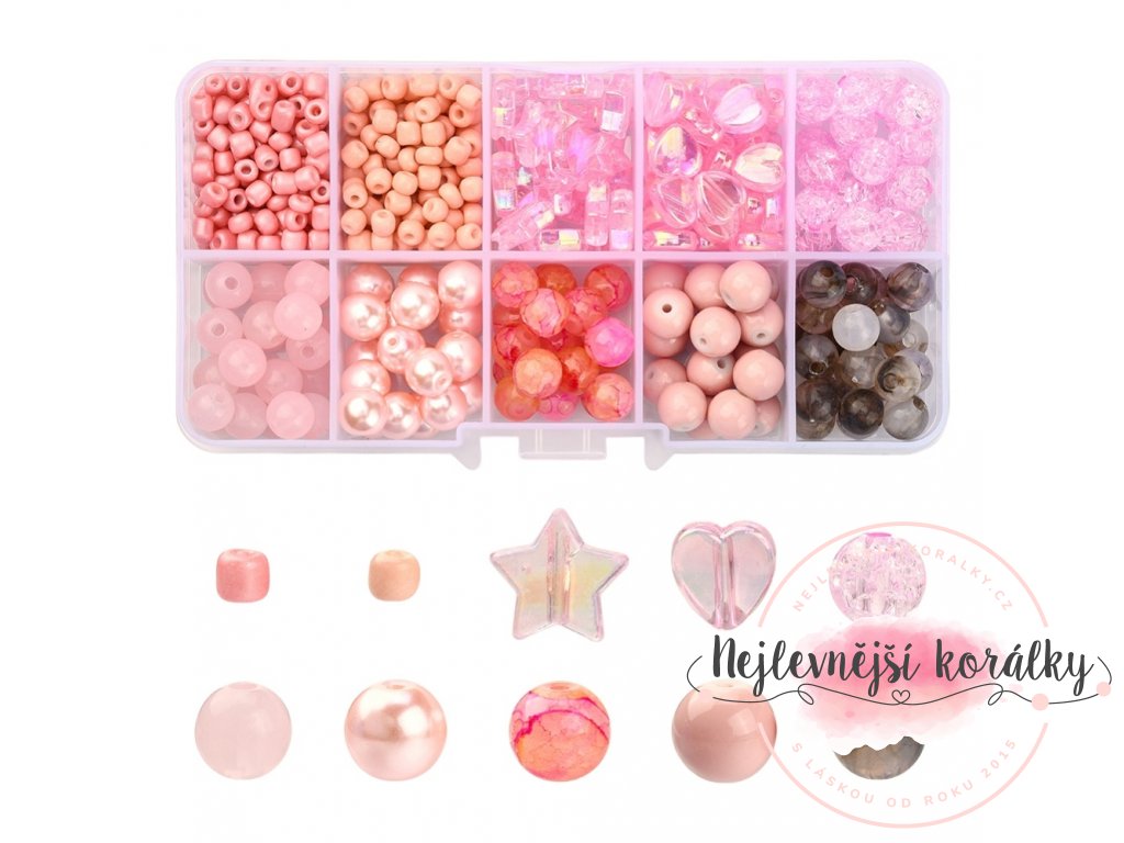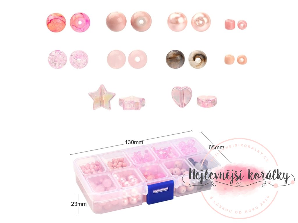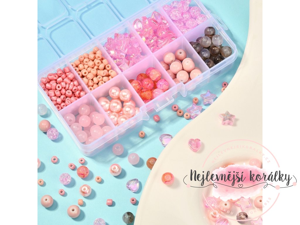 Plastová krabička obsahuje celkem 10 přihrádek akrylových a skleněných korálků, jedna přihrádka je plná akrylových růžových srdíček.