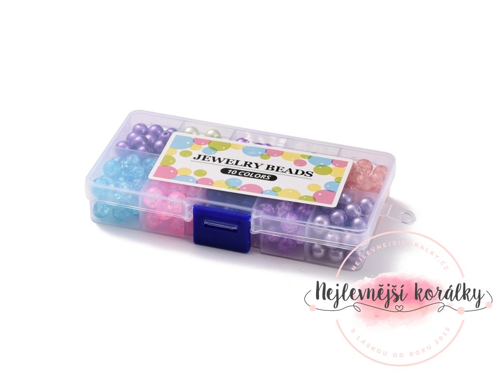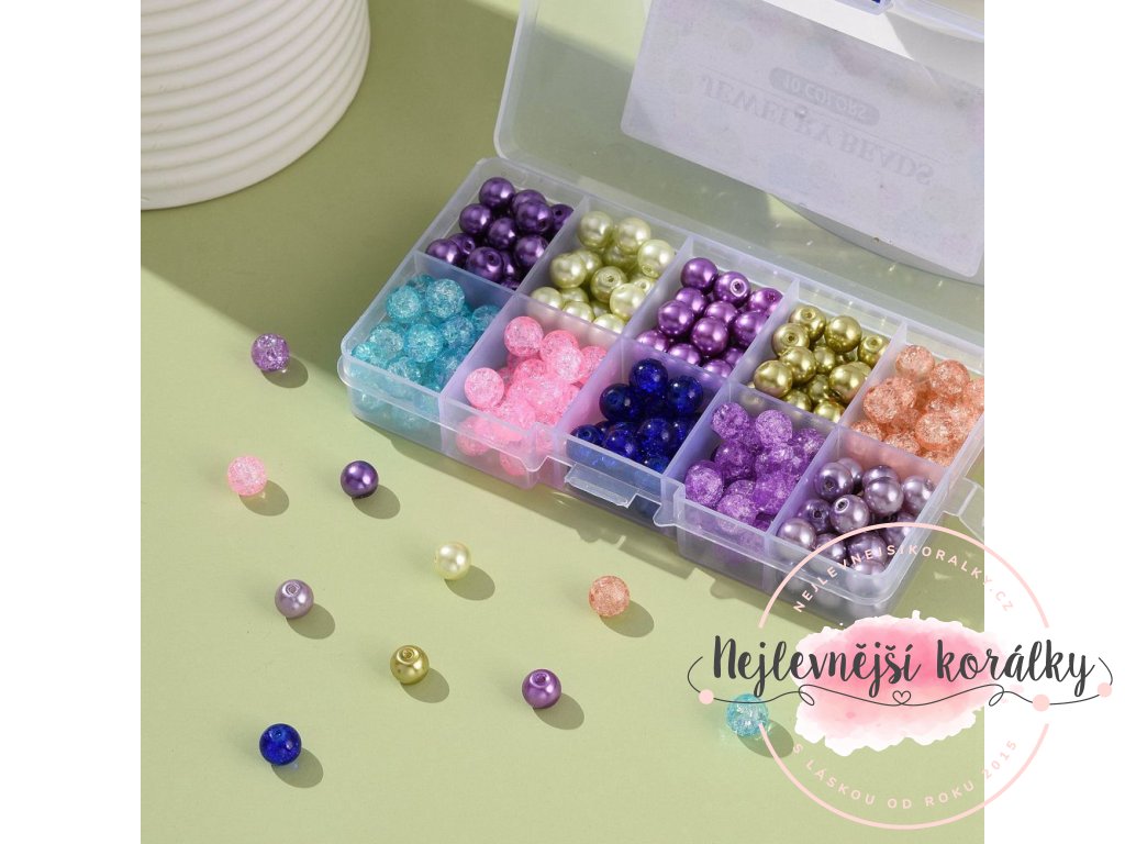 Plastová krabička obsahuje celkem 10 přihrádek voskovaných perel a praskaných korálků v různém barevném provedení.