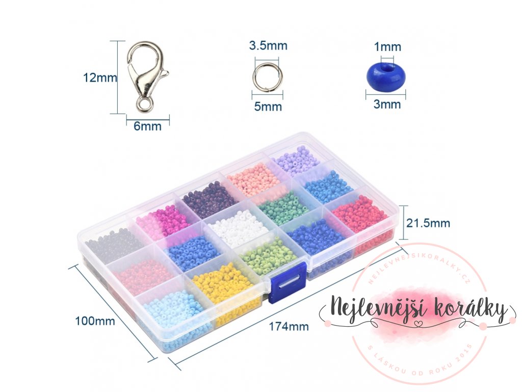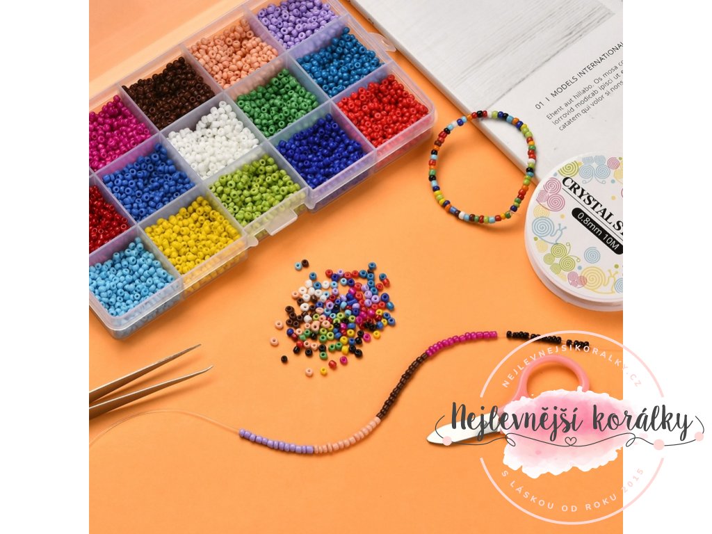 Skleněný rokajl - 8/0 - krabička s příslušenstvím - mix barev - Ø ~ 3 mm - 4 900 ks - 1 balení