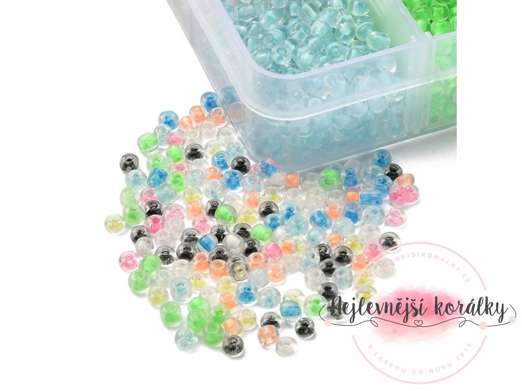 Skleněný rokajl - krabička - transparentní s průvlekem - luminiscenční - 3,5 x 1,6 mm - 3600 ks - 1 balení