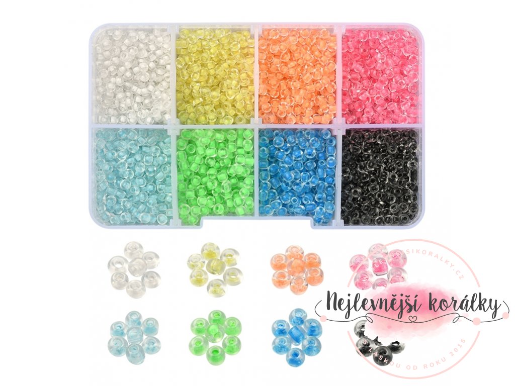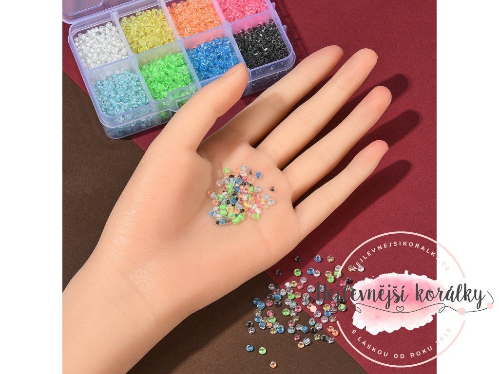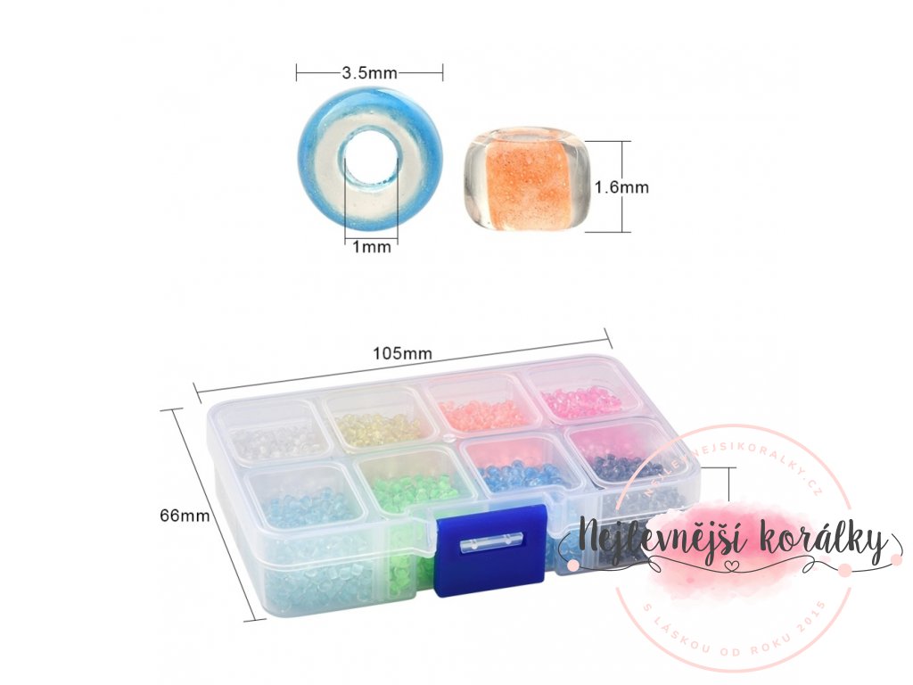 Pěkná plastová krabička obsahuje celkem 8 přihrádek různých barev rokajlu.