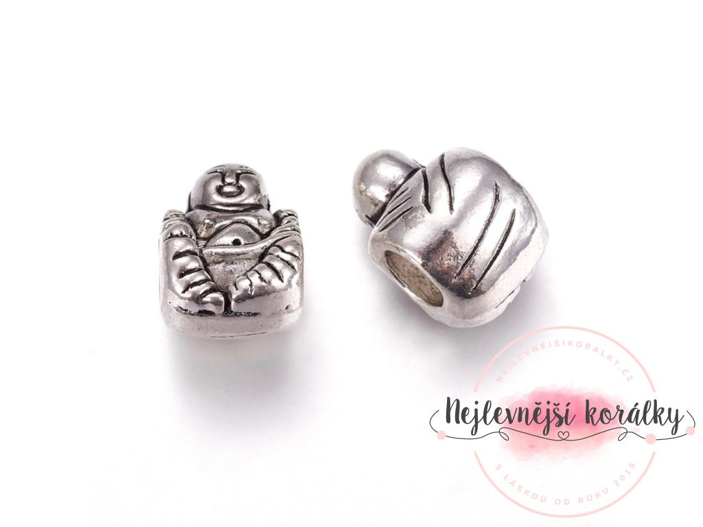 Korálek ve tvaru Buddhy s širokým průvlekem ve starostříbrném provedení je vyrobený z bižuterního kovu.
