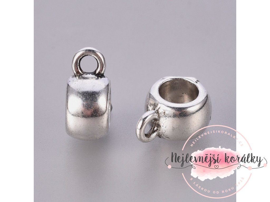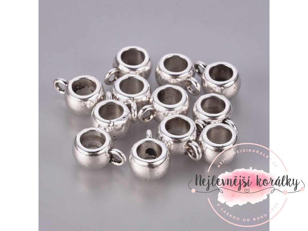 Soudkový korálek se širokým průvlekem a očkem o délce 11,5 mm, šířce 8 mm, hloubce 5,5 mm s velikosti průvleku 4,8 mm a očkem s průvlekem 2 mm.