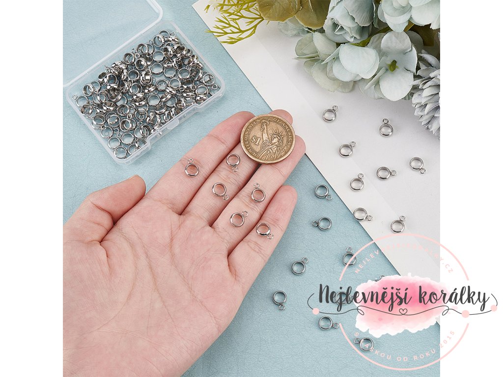 Rozměry: cca 10 mm délka, 7 mm šířka, 2.5 mm tloušťka, vnitřní průvlek 5 mm, očko s otvorem 1.6 mm.