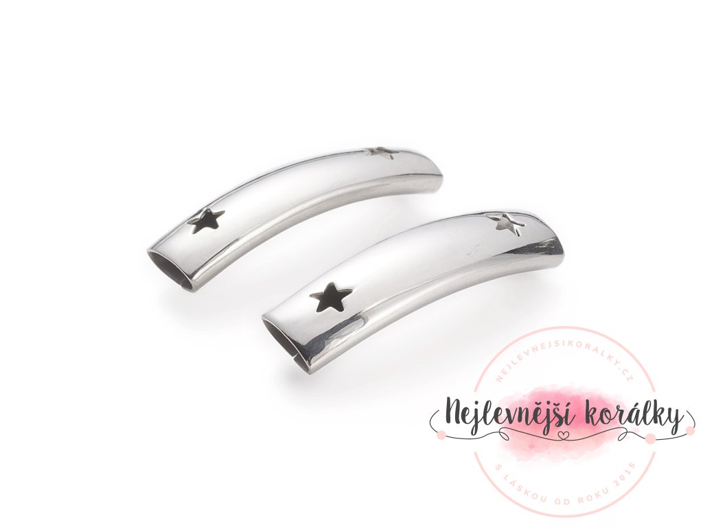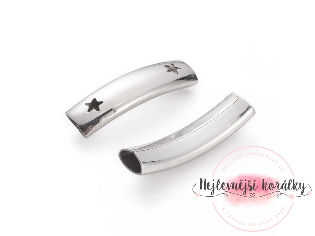 Trubičkový korálek z nerezové oceli - prohnutý - hvězdy - platinový - 36 x 10 x 8 mm - 1 ks