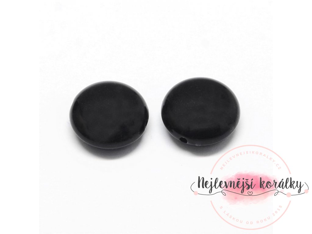 Akrylové korálky v černém provedení o délce 14 mm, šířce 14 mm, hloubce 6 mm s velikostí průvleku 2 mm.