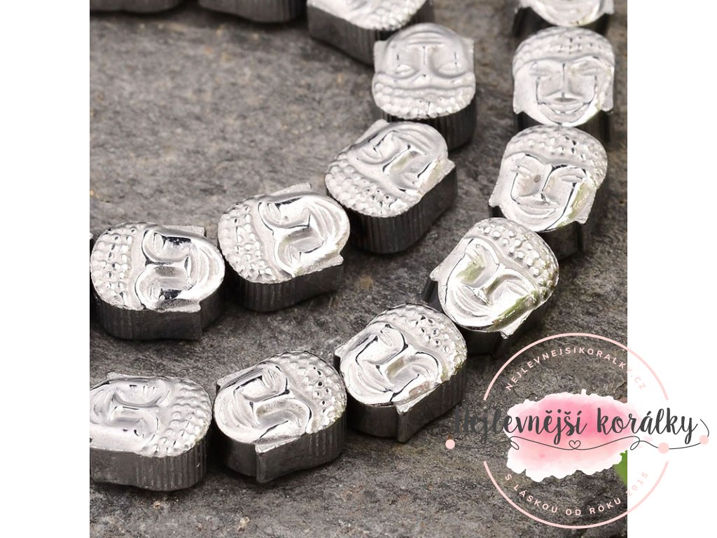 Korálky ze syntetického minerálu hematit ve tvaru hlavy Buddhy.