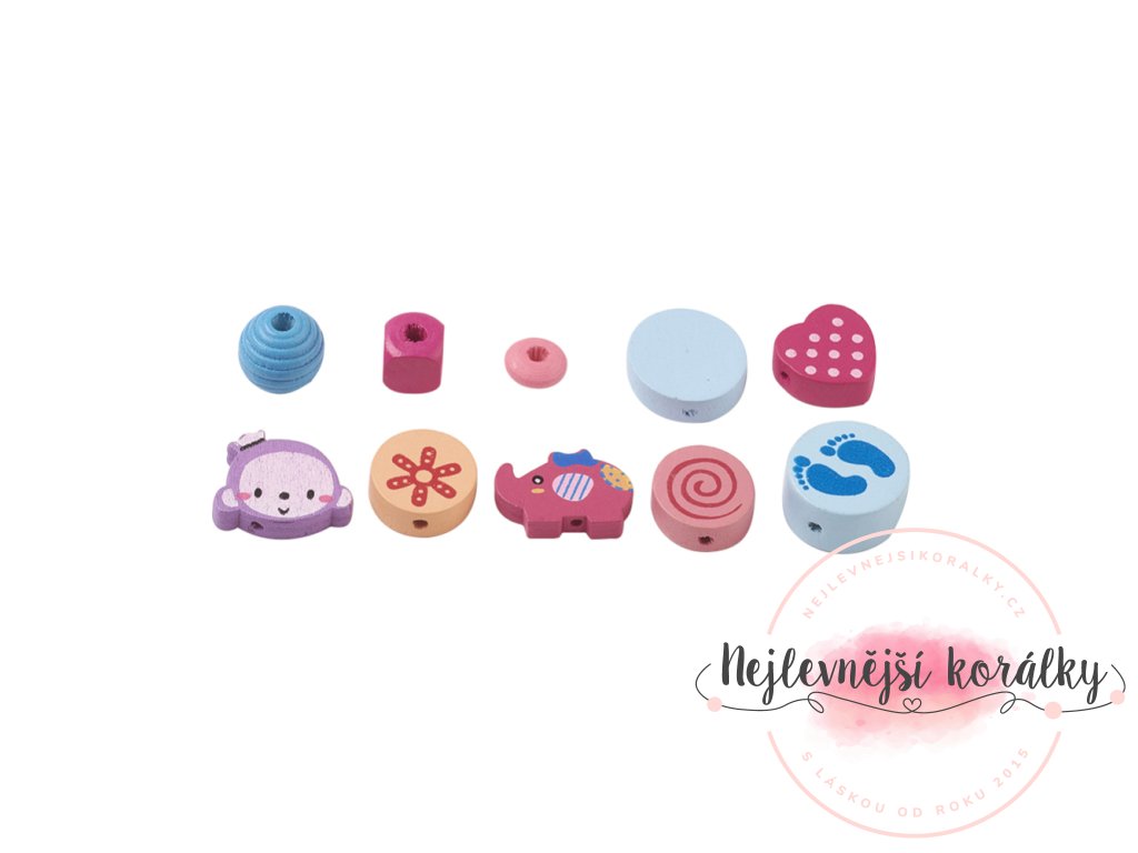 Dřevěné korálky s dětskými motivy v různých tvarech s velikostí průvleku 2 ~ 4 mm.