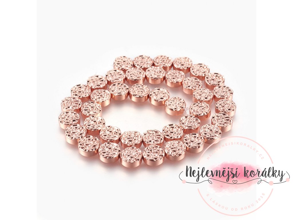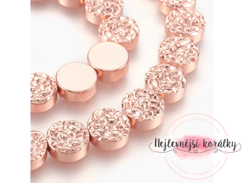 Korálky jsou syntetické, nemagnetické a jsou dobarvovány pokovením do růžově zlaté barvy.