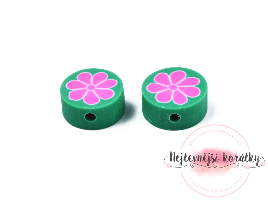 Korálky z polymerové hmoty ve tvaru plochých koleček s krásným květinovým motivem.
