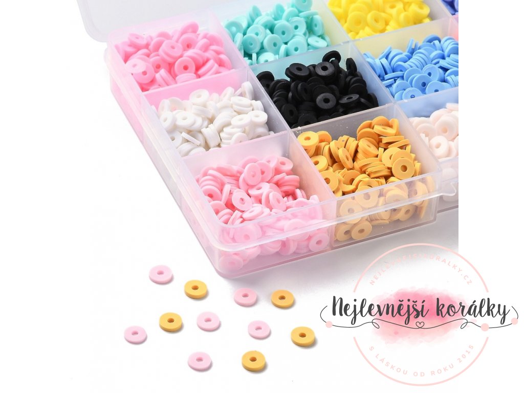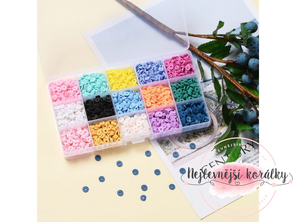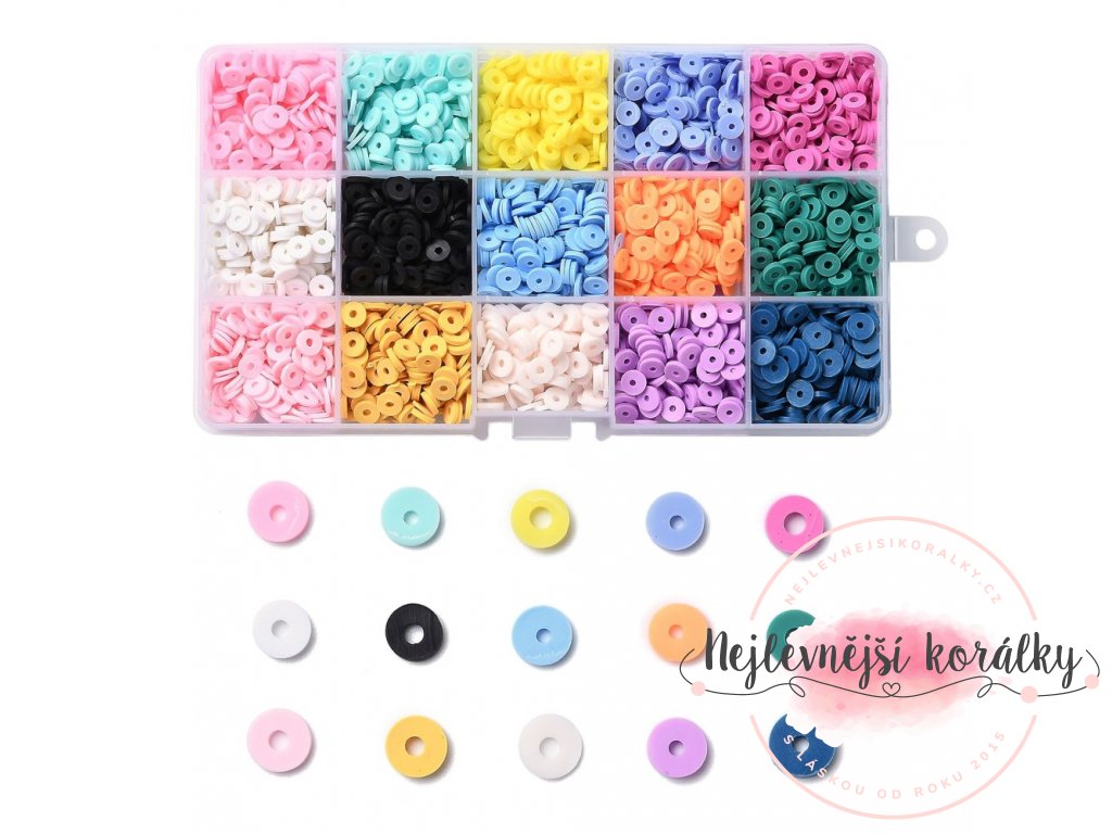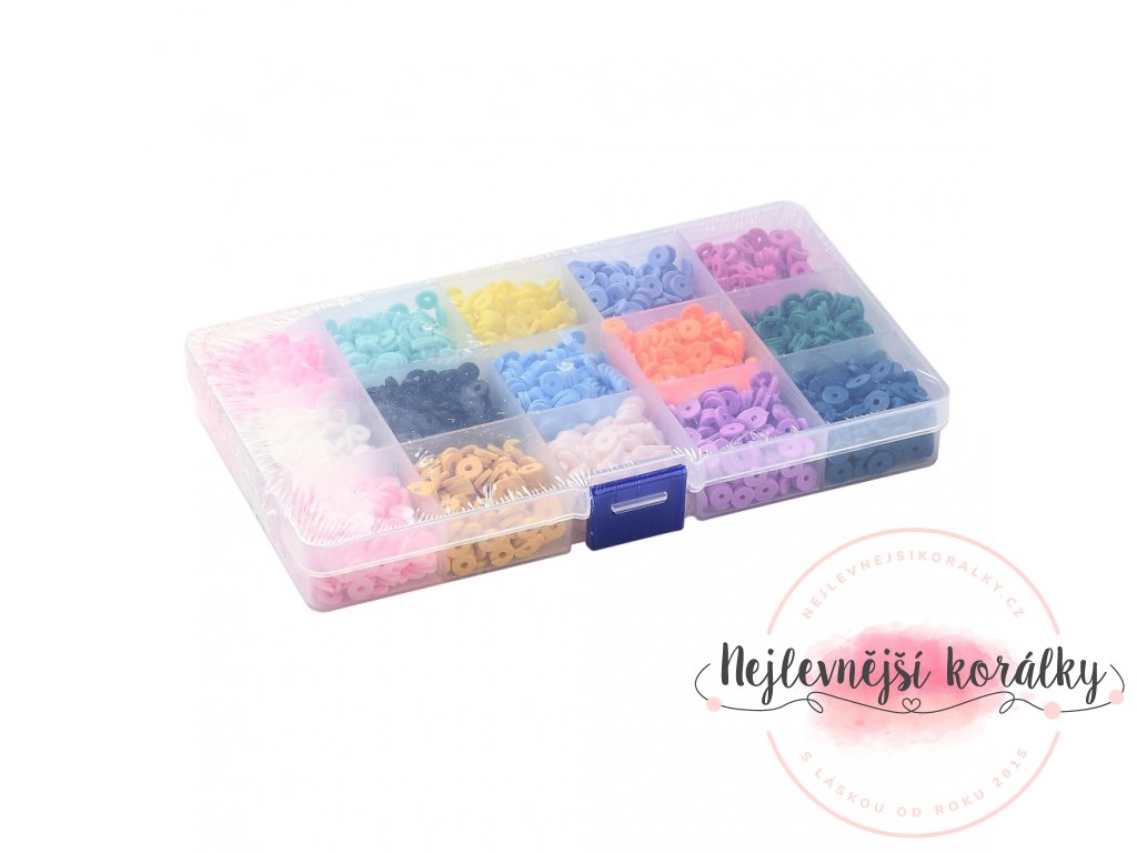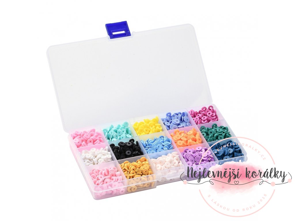 Plastová krabička obsahuje celkem 15 přihrádek polymerových lentilek v různých barvách.