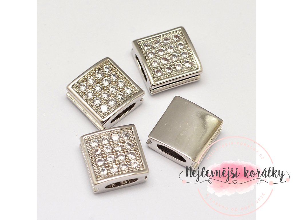 Luxusní korálek ve čtvercovém tvaru o rozměrech 9 x 9 x 3 mm s velikostí průvleku 5 x 1,5 mm osázený pravými čirými kubickými zirkony AAA kvality ve zlatém, stříbrném a černém provedení.