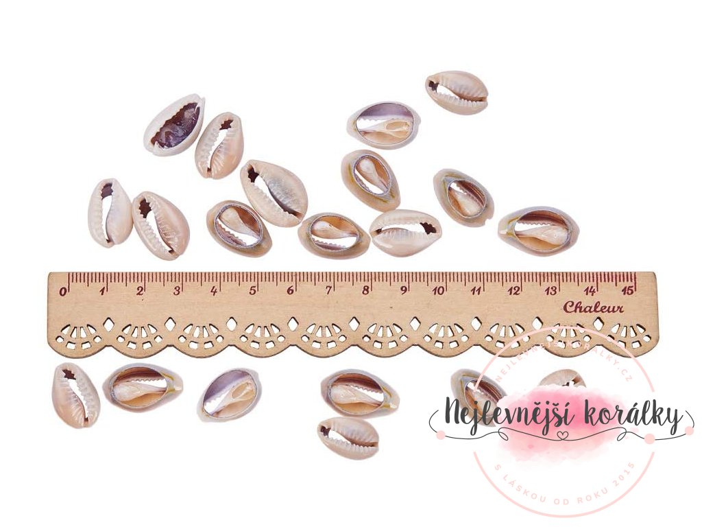 Přírodní kauri mušle o délce 18 ~ 20 mm, šířce 12 ~ 13 mm, hloubce 6 ~ 8 mm s velikostí průvleku o délce cca 10 ~ 14 mm a šířce cca 2 ~ 3 mm.
