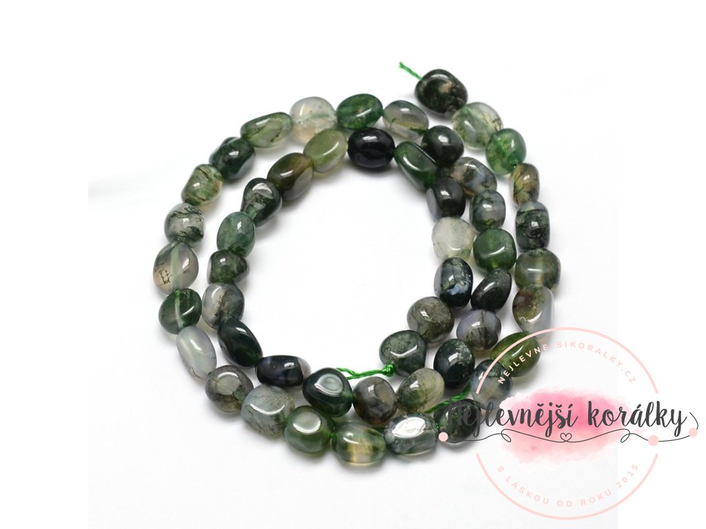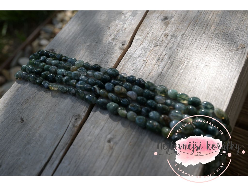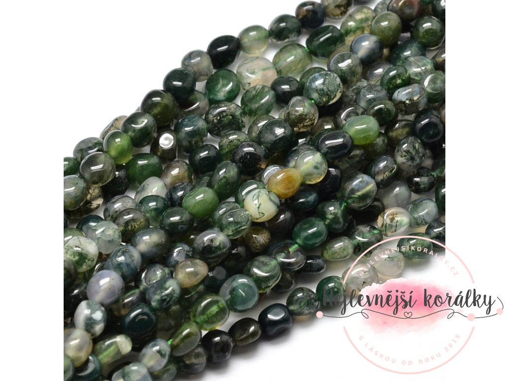 Přírodní korálky z minerálu mechový achát ve tvaru nugetek o délce 5 ~ 10 mm, šířce 6 ~ 7 mm, hloubce 3 ~ 7 mm.