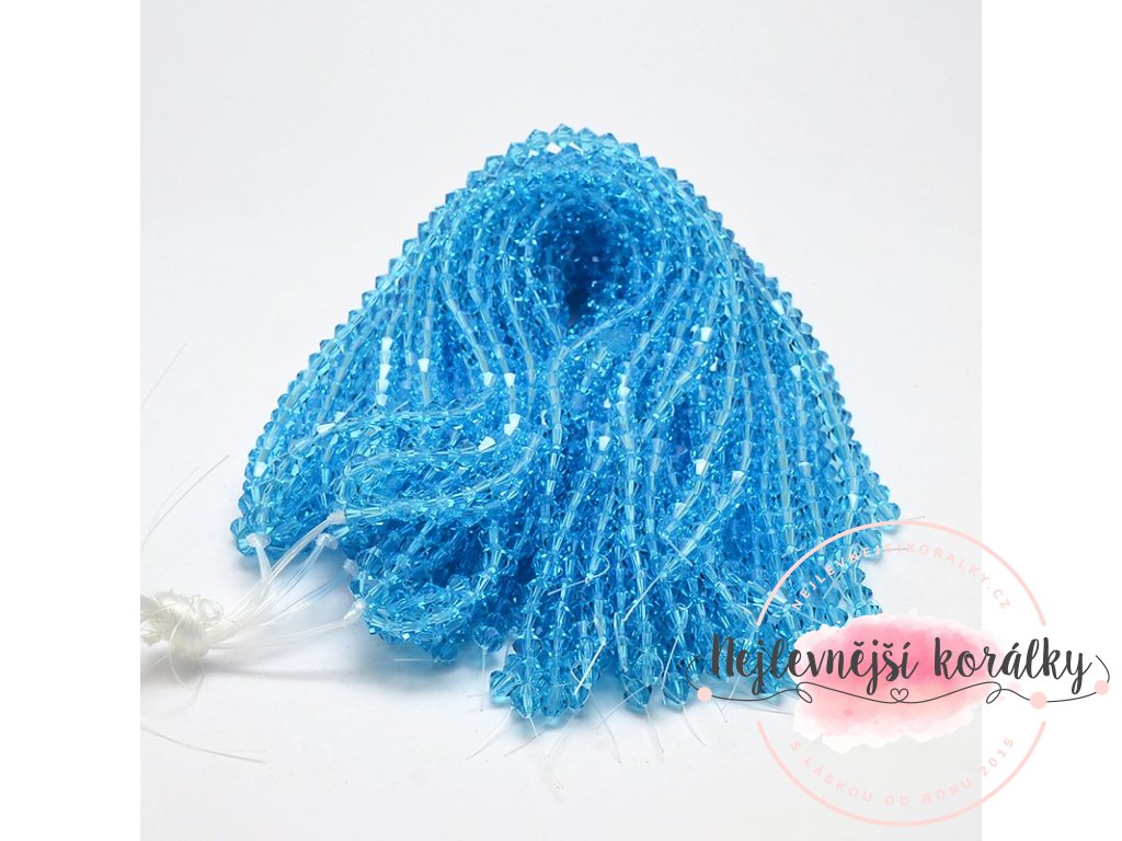 Skleněné korálky v nebesky modrém průsvitném provedení o velikosti 4 x 4 mm s velikostí průvleku 1 mm.