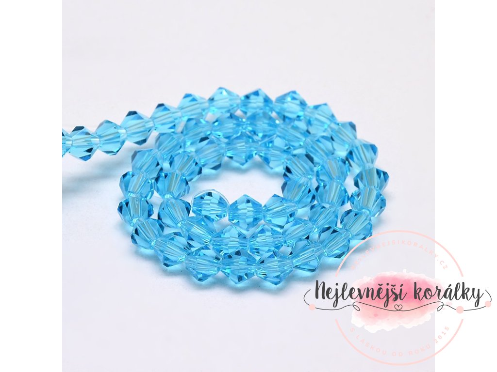 Korálky jsou vyrobeny ze skla a upraveny do tvaru broušeného dvoukuželu (bicone).