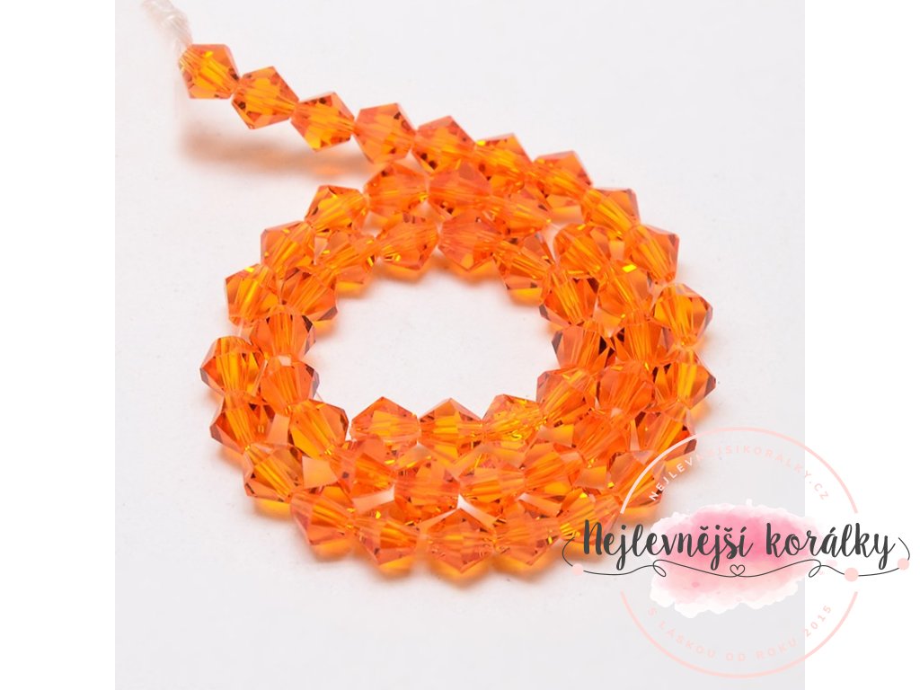 Skleněné korálky v neonově oranžovém průsvitném provedení o velikosti 4 x 4 mm s velikostí průvleku 1 mm.