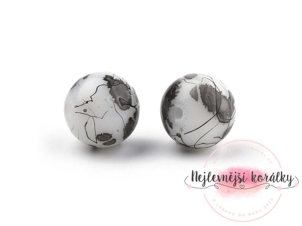 Skleněné korálky v černo bílém provedení o průměru 6 mm a velikostí průvleku 1 mm.