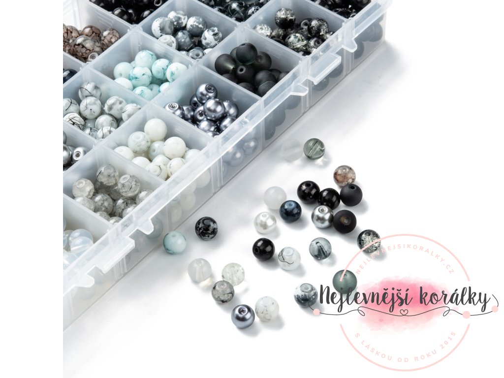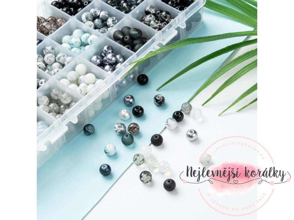 Jedna přihrádka obsahuje 27 ~ 30 kusů různých barev ( černá, šedá, stříbrná, bílá, tyrkysová). celkem je v krabičce 648 ~ 720 kusů korálků.