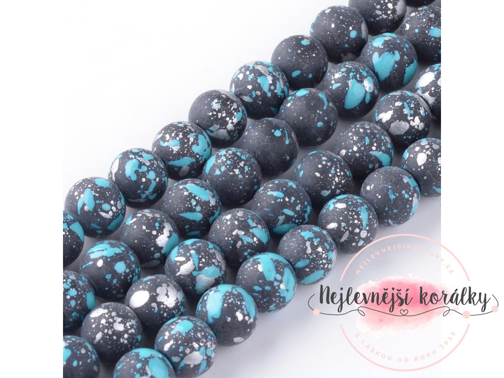 Skleněné korálky v černém provedení s modro stříbrným prskáním o velikosti cca 8 mm s velikostí průvleku cca 1 mm.