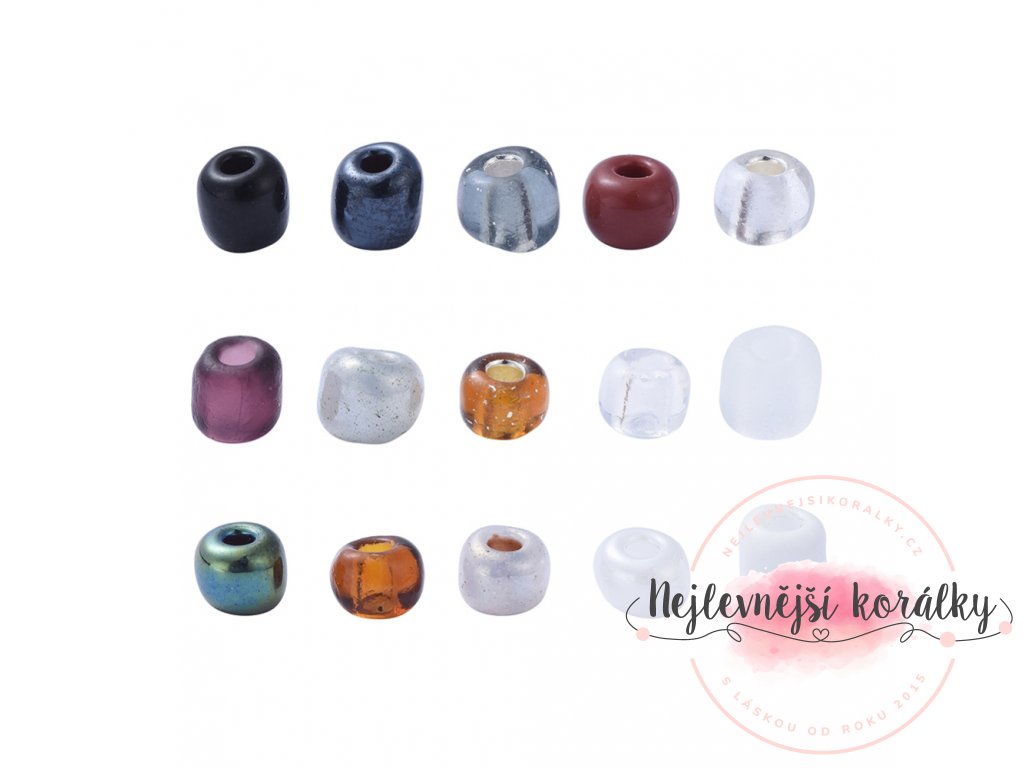 Skleněný rokajl o průměru 4 mm (6/0) s velikostí průvleku 1 až 1,5 mm.