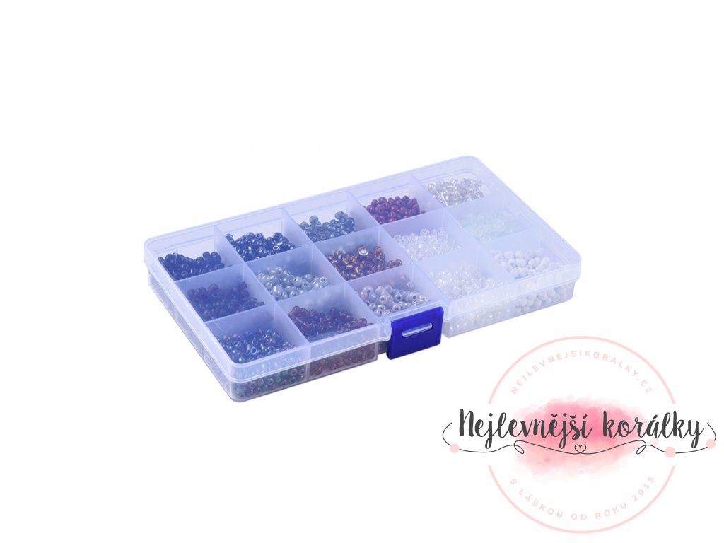 Plastová krabička obsahuje celkem 15 přihrádek rokajlových korálků v různých barvách - černé, šedé, bílé, transparentní, s duhovým efektem...