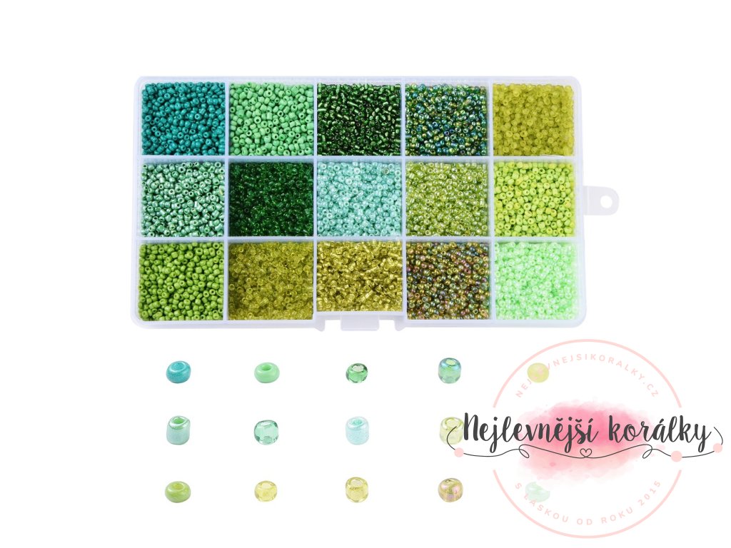 Plastová krabička obsahuje celkem 15 přihrádek rokajlových korálků v různých odstínech zelené.