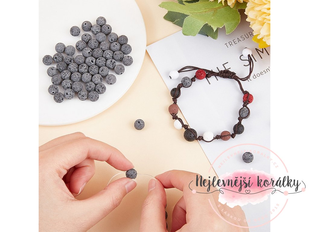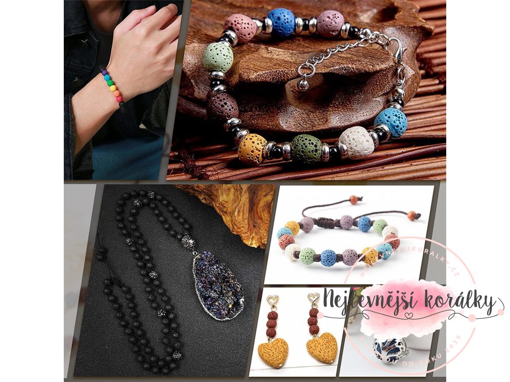 Lávové korálky mají pórovitou strukturu a jsou velmi lehké. Nadchnou Vás nejen drsným povrchem, ale také zvláštními nepravidelnými póry, tvořícími v korálku až drobounké jeskyně. Lávová hornina je extrémně lehká a jako jediná z minerálů plave v surovém stavu na hladině vody. Tóny barev se mohou mírně lišit, a právě to dělá z přírodních lávových korálků úžasný prvek pro výrobu vlastních šperků či ozdob. Díky struktuře se dají s úspěchem uměle dobarvit a tak rozšiřují své využití.