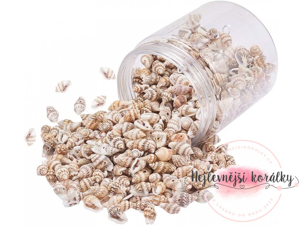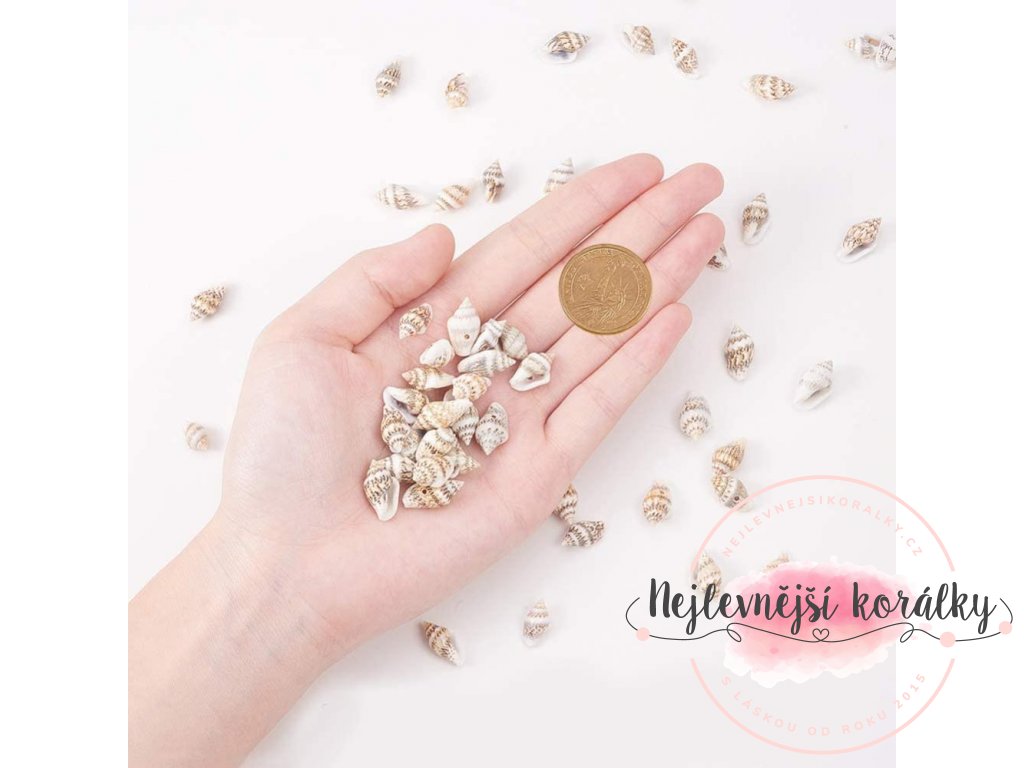 Přírodní mušle o výšce 15 mm, šířce 7 mm, hloubce 7 mm s velikostí průvleku cca 1,5 mm.