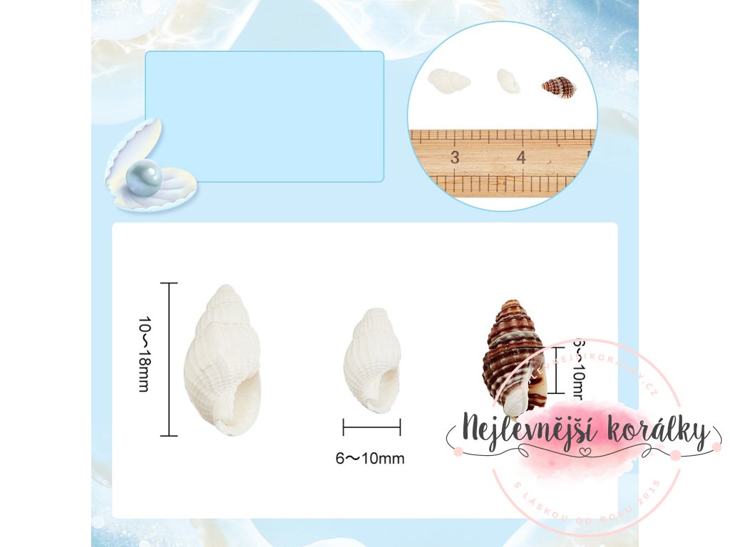 Přírodní mořské malé mušle o výšce 6-10 mm, šířce 10 - 18 mm, hloubce 6 - 10 mm s velikostí průvleku cca 0,8 - 1 mm.